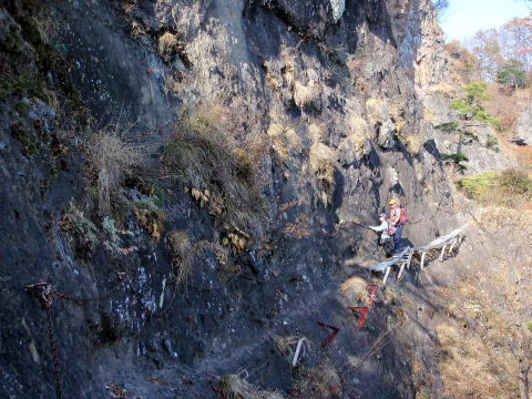 続いて現れるのが烏帽子岩の岩場のトラバースです。鎖と梯子が付いていますが高度感満点です。