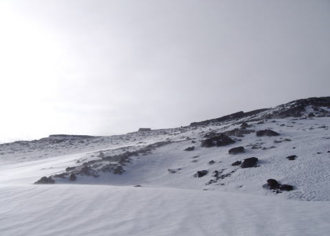 9合目からの山頂。雪も増え雪山らしくなりました。クラストしているところもあり要注意でした。
