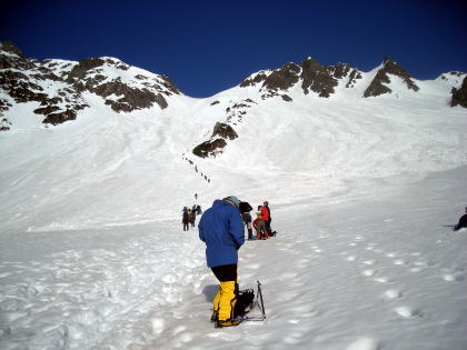 小屋を出発してから、約30分歩いた付近です。奥穂を目指す列ができていますが、先頭はまだコルまでは到着していないようです。
