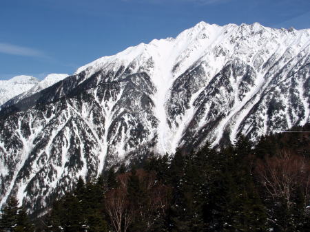 4月の企画「西穂高西尾根」は写真手前から2つ目の尾根をつめ、稜線へ抜けます。