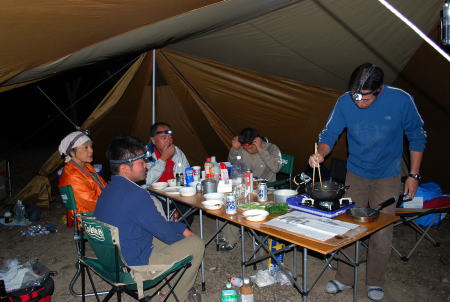 懇親会前に採ったコシアブラやフキノトウなどの山菜のほかに、レンコン、エビ、ジャガイモなどの定番の具です。熱々を外で食べると旨い!!