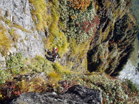 核心部の上、40mの濡れた凹角を登ると草付テラス(写真)にでます。ここにもハンガーボルトが。さらに悪い草付を2ピッチ登って終了しました。