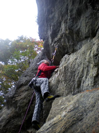 締めは「股旅:5.9」。ハング下をトラバースして上に抜ける楽しいルートです。ハング気味のトラバースで腕力を消耗せずに、素早く登るのがポイントです。