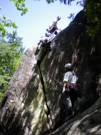 「セレクション:5.8」の1P目のクラックを登る遠藤=D嬢=S川氏パーティ。上手くジャミングを決めて、左上のピナクルを取れれば終了の5〜6手のピッチですが、なかなか難しい!!