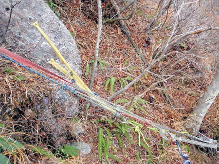 北稜2p目の支点はグラグラする木に巻いてあるシュリンゲで懸垂となる。バックアップも細い木なので、今回は新しく購入した振動ドリルで岩にリングボルトを打ち込んで、バックアップを作った。