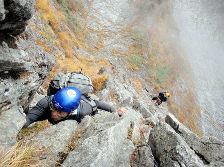 ちょうど核心突入中のH氏とビレイする初級生N氏。
