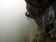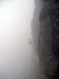 翌朝は雨は降っていないものの、ガスっています。岩場は濡れているようでしたが、とりあえず行って見ることに決定。岩場に行ってみると何とか登れそうなので、マルチピッチ組とトップロープ&リード組に分かれて講習となりました。岩場はガスって展望はイマイチでしたが、クライマーも少なく、混雑はほとんど無く登攀できました。午後2時過ぎには終了しましたが、その後は落雷&土砂降りの三つ峠でした。