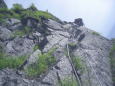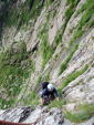 午前6時前に変形チムニーに取り付きました。下部4ピッチ=すべてが濡れていて、不快&困難でした。4&5ピッチ目をリードしたK氏は、この2ピッチで相当疲れたようでした。中央カンテと合流してからは快適なクライミングとなり、午前9時半ごろ奥壁の肩にでて終了。肩から25mの懸垂、トラバース50mで南稜終了点上部に出て、南稜を懸垂下降しました。南稜の2パーティはまだ最終ピッチの下にいました。