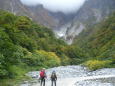 | 10月の一ノ倉沢は土日曜日は車両通行止めになりました。そこで平日はいつもの通り一ノ倉沢出合いまで車で入れるので便利です。しかし、10月1日(水)は台風が関東地方に最も近づいた日で、一ノ倉沢出合いに張ったテントも一時飛ばされかかりました。夜半は暴風が吹き、車で寝ていた人は、車が動いたそうです。翌朝は風もやや収まりましたが、一ノ倉沢上空は雲に覆われていましたが、水上方面で雲はちぎれるようなので、今後の天候回復が期待されました。午前5時前に出発し、ひょんぐりノ滝を高巻き懸垂下降しましたが、今年は懸垂下降用のロープがありませんでした。中央カンテ取り付きに午前7時。終了は午前11時半ごろでした。このころになると風も止み、青空が広がり、谷川岳の稜線近くは紅葉が満開!あまりのすがすがしさに稜線経由で帰ることになりました。久しぶりの稜線への道は、登る人が少なくなったのか、少し荒れていて笹で道が隠れている部分が多くなりました。一ノ倉岳から芝倉沢へ下り、一ノ倉沢出合いの戻ったのは午後4時半でした。長い道のりでしたが、充実感満点でした。なお、カメラを忘れて、携帯で撮った写真なので画像が悪くなりました。 |