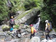 翌日は小川谷廊下へ行きました。もう一名の参加者を駅に迎えにいく遠藤Gと、先発の福田G組とに分かれて出発しました。F1、F2を越えて、休憩していると遠藤Gパーティが追い付いたので、一緒にゆっくりと渓流登りを楽しみます。小川谷の素晴らしい滝や廊下を存分に味わって、最後のF12を越え遡行は終了。後は登山道へ合流し、山歩きを1時間で「県民の森」近くの道路(廃線した道路)にでて終了しました。釣りながら沢登も楽しいですが、やはり日帰りだと時間に押されてしまうので大変でした。
