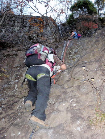 金洞山の西岳と東岳のコルから中の岳への登りとなります。中の岳直下はご覧のように垂直の鎖場5mが2つ連続しています。
