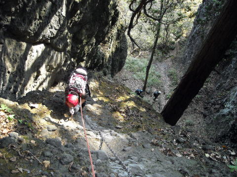 表妙義山縦走のフィナーレに近づき、最後の難所の「奥の院」への連続した鎖場の下り。